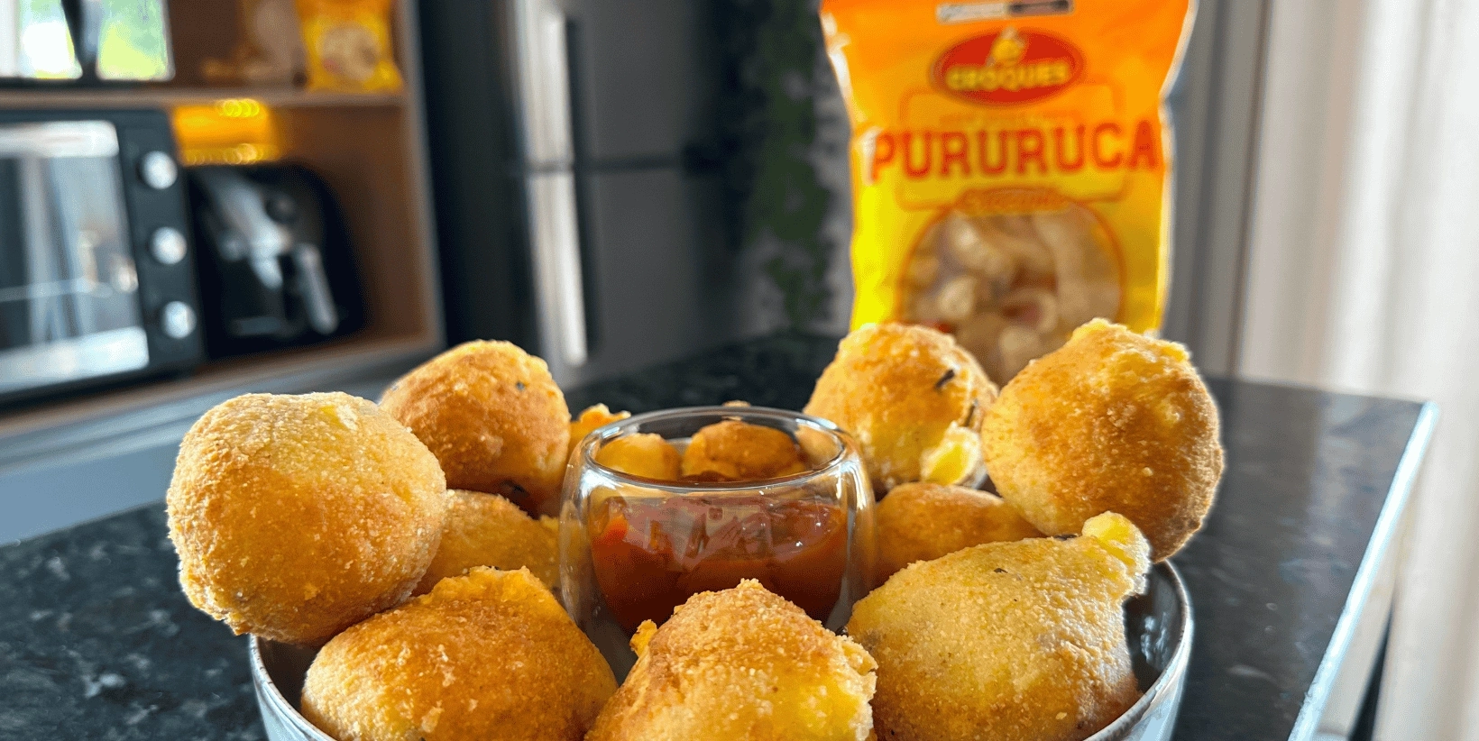 Uma ideia criativa para servir como petisco ou entrada. A massa leva muçarela ralada, pedacinhos de Pururuca Croques, ovo e amido de milho. O resultado é um bolinho crocante por fora e macio por dentro. Clique aqui para aprender o passo a passo dessa receita fácil e deliciosa.