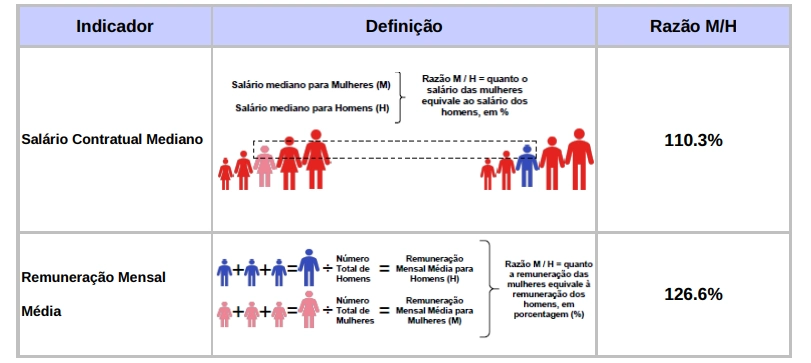 O relatório aponta que o salário mediano das mulheres equivale a 110.3% do recebido pelos homens. A remuneração média mensal das mulheres equivale a 126.6% da recebida pelos homens. Esses números refletem os esforços contínuos para garantir que a equidade salarial seja uma realidade.